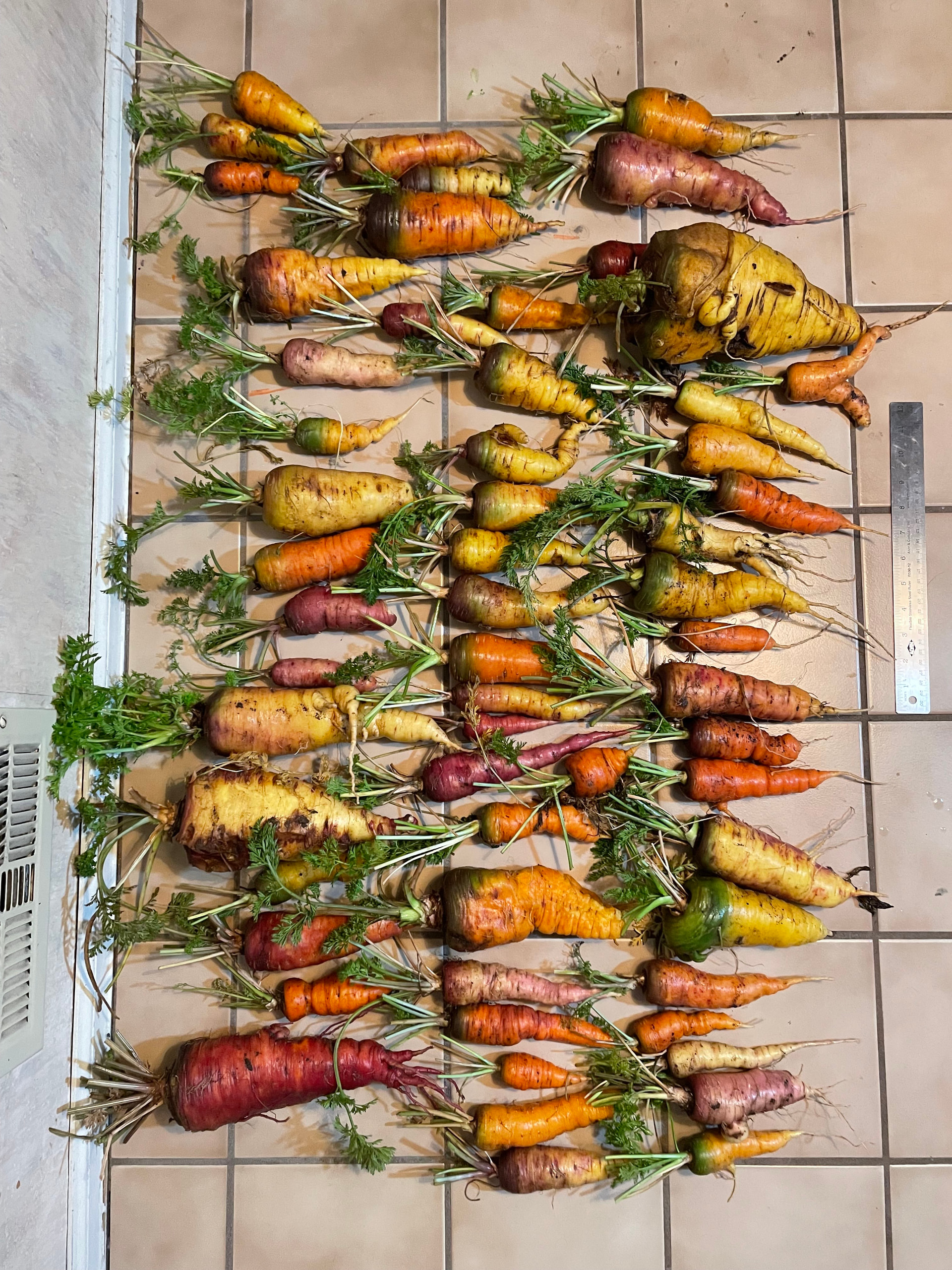 I want my carrot landrace to be brightly colored, both because I prefer bright colors and to make contamination from the ubiquitous Queen Anne’s Lace obvious. (White is dominant over orange in carrots.) I want a large, blocky shape which makes processing more efficient, rather than a long thin shape or a cone shape. And, of course, I want them to taste wonderful. So I tasted all the large, brightly colored carrots, and kept any that were at least fairly good tasting, ones that I would happily eat raw. (I figure that I can refine the taste in later generations; only one carrot had absolutely excellent taste.) I also tasted some of the white ones out of interest. As might be expected, the enormous white carrot didn’t taste that good, and was also hollow inside. The odd shapes are partly the result of growing in paths.