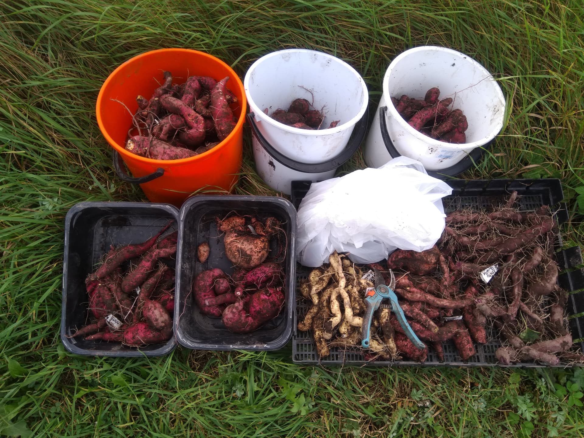 Sweet potato harvest was quite poor, but that was a bit expected when I started this trial. They need quite a lot of heat and just black plastic with cloth generally isnât enough here, especially with about average summer in temperatures. But there was one variety that stood out. I only had 3 plants of it, but it produced just under 5kg (I think thatâs 11 pounds) which is far better than any other variety and what I was hoping for. Itâs one of the 3 unnamed varieties I got from a Belgian breeder. There were otherâs that had some promise, but nothing that really stood out. Results might have been affected by early season drought and overall management so others might do better and that one even better. Next year likely to have lotâs from that one variety for production and some of the others as sample trial or in pots for flowers. This year only 2 varieties have had any significant flowering, best variety being one of them. Havenât got any of them crosspollinated dispite many tries. Have some of them in pots in my classed balcony and might take them indoors later to see if I can induce flowering and get any pollinated.