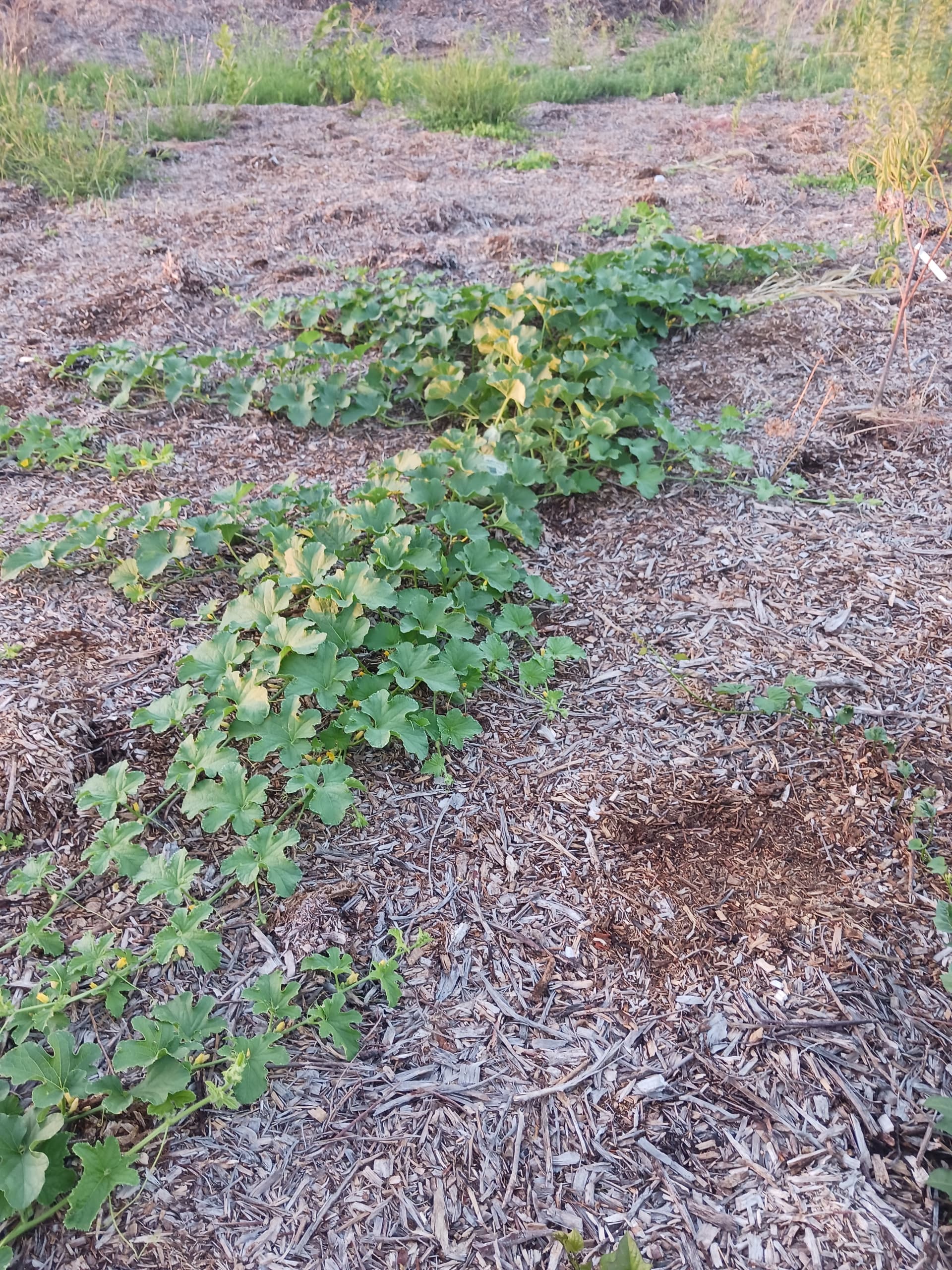 Watermelons report. 3rd season here, in clay soil, winter planted, adapting to clay soil, heat, and no culinary water. The woodchip mulch is thinning as the soil underneath improves.